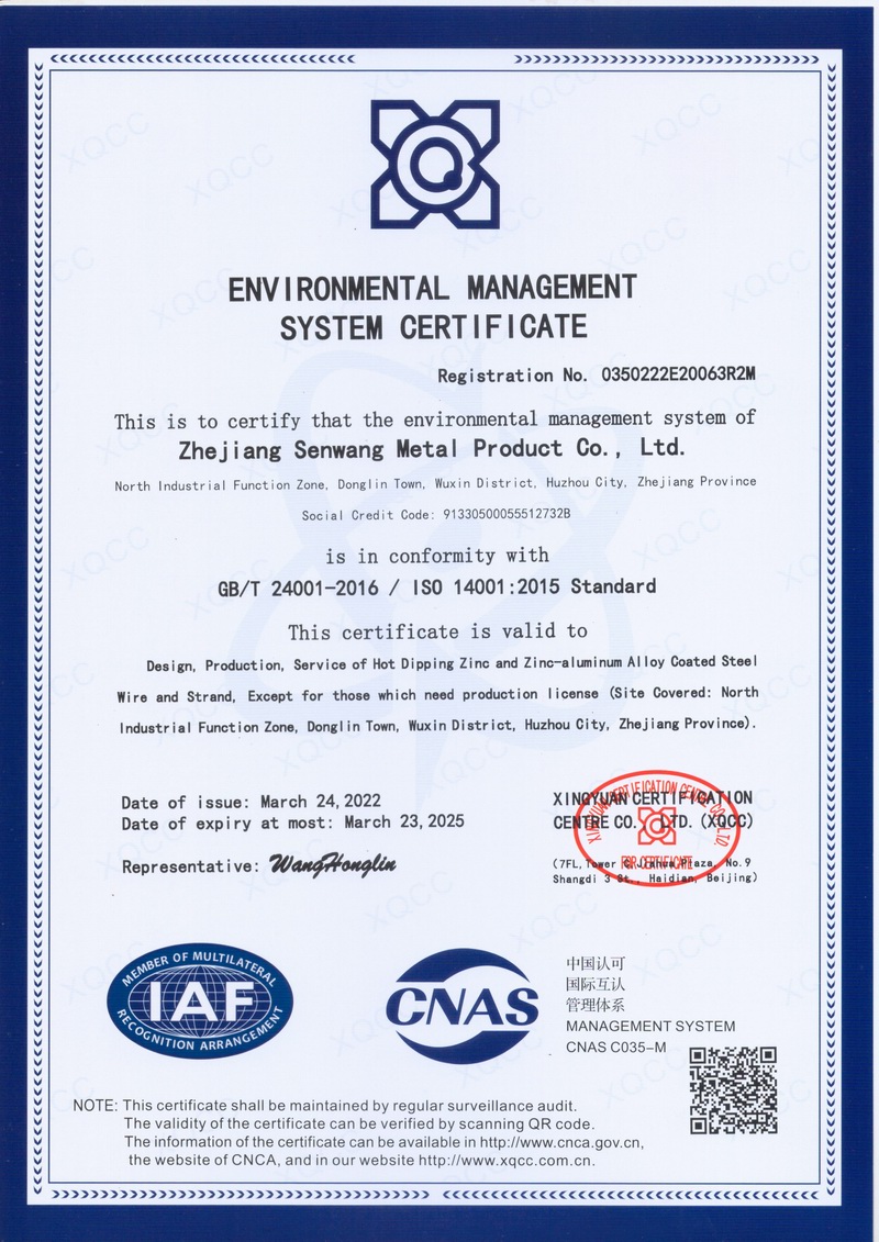浙江森旺金屬制品有限公司成立于2012年,坐落湖州市吳興區東林鎮工業功能區。公司專業從事各類鍍鋅鋼絲、鋼絞線等產品的開發及生產。目前產品已廣泛應用于各類通信光電纜,電力輸送,電氣化鐵路工程,各類堤壩防護及農業溫室等工程領域。公司秉承“追求卓越品質,創建卓著信譽”的經營理念,始終堅持專業化、規?;慕洜I模式。